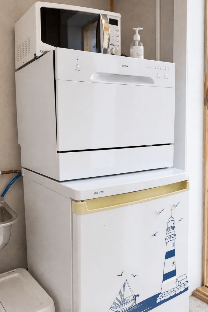 Servicebygget har tre toaletter og tre dusjer med ubegrenset varmt vann. Det finnes vaskemaskin, oppvaskmaskin, mikrobølgeovn og kjøleskap med liten frysedel. Vi tilbyr også utleie av håndklær og sengetøy.
