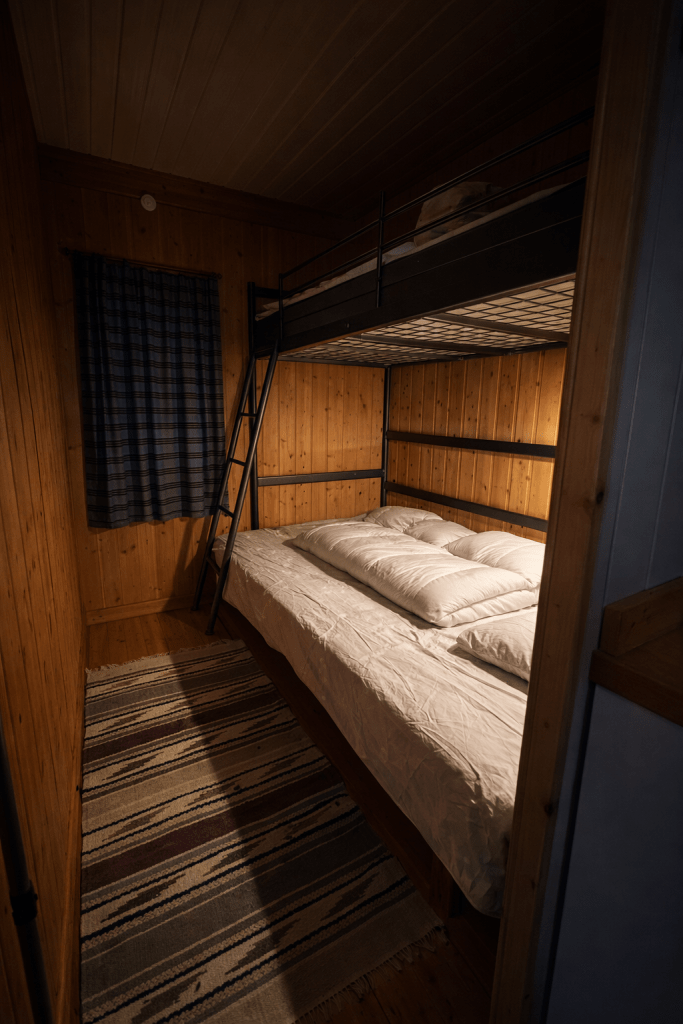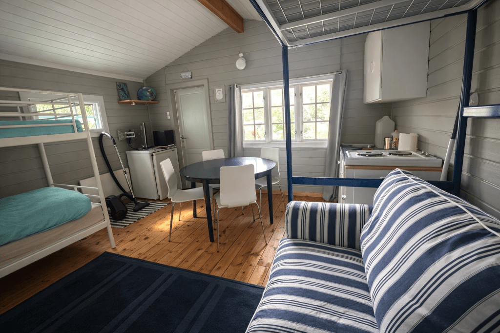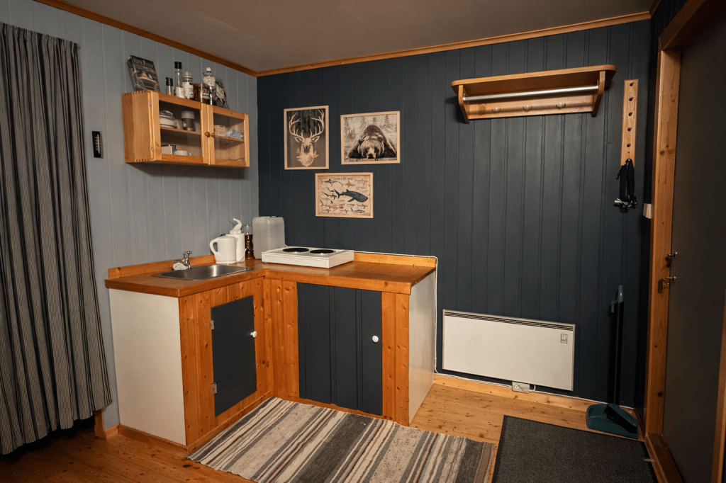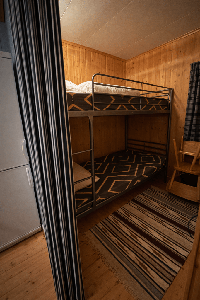 Hytte 2 består av ett rom med køyeseng, loftseng og sovesofa. Kjøkkenkroken har det du trenger for enkel matlaging, kjøleskap og hybelkomfyr.