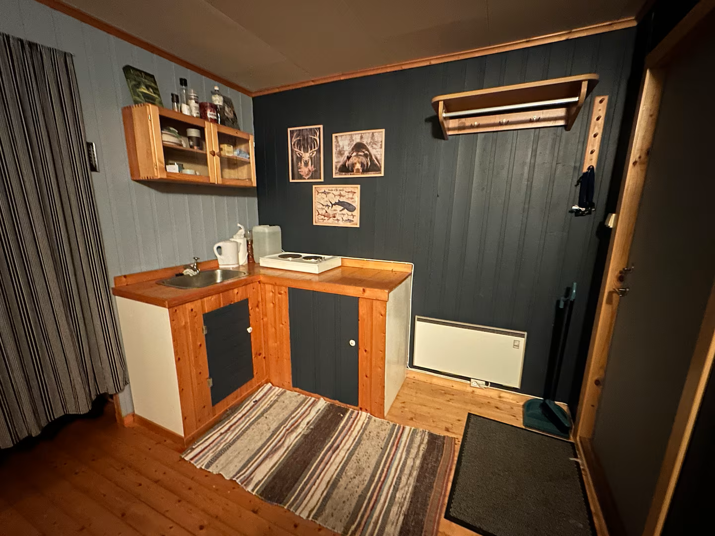 Kjøkkenkroken har det du trenger for enkel matlaging. Vi har også satt inn en hybelkomfyr som ikke vises på dette bildet. Det er også ett kjøleskap.